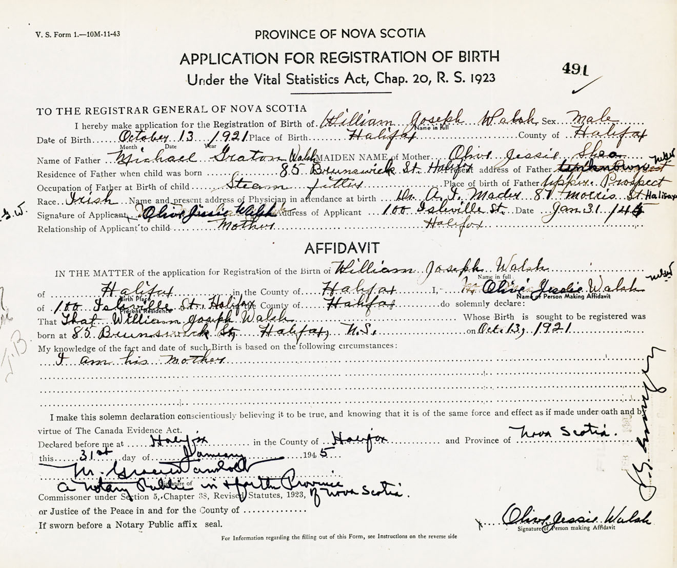 Signature of Applicant Olive Jessie Walsh Address of Applicant 100 Isleville Street, Halifax, NS Date 31 January 1945