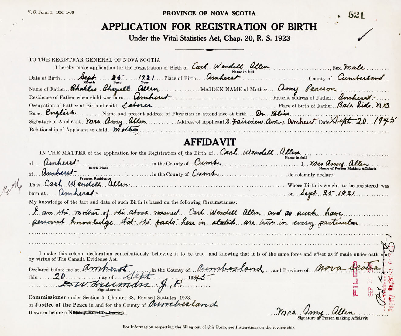 born at Amherst Cumberland County on September 25, 1921