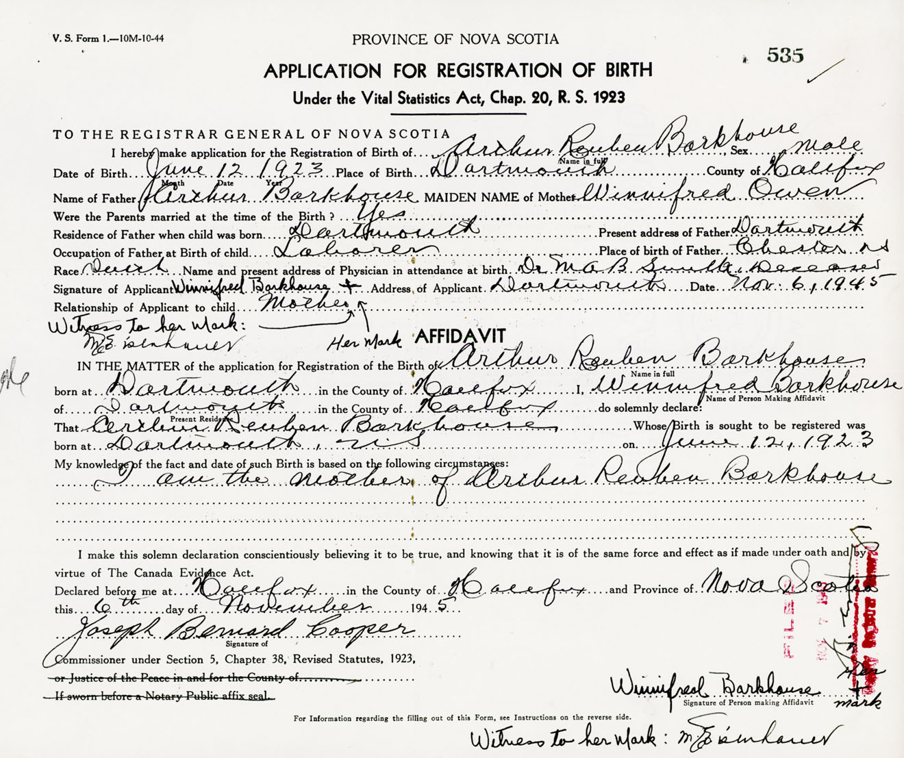 I hereby make application for the Registration of Birth of Arthur ReubenBarkhouse Sex Male