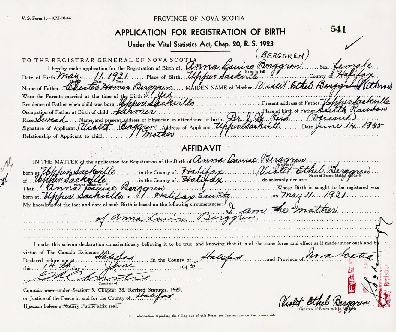 Signature of Applicant Violet Berggren Address of Applicant Upper Sackville, Halifax, NS Date 14 June 1945