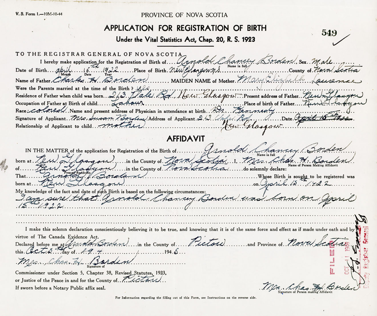 born at New Glasgow Pictou County on April 15, 1922