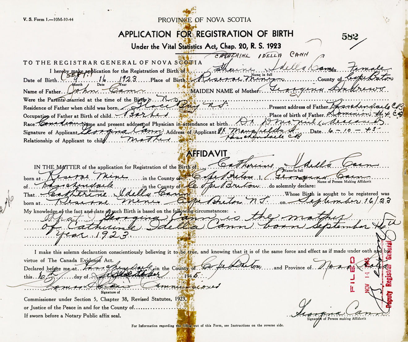 Signature of Applicant Georgina Cann Address of Applicant 89 Mansfield Street, Passchendaele, Cape Breton Co., NS Date 6 October 1945