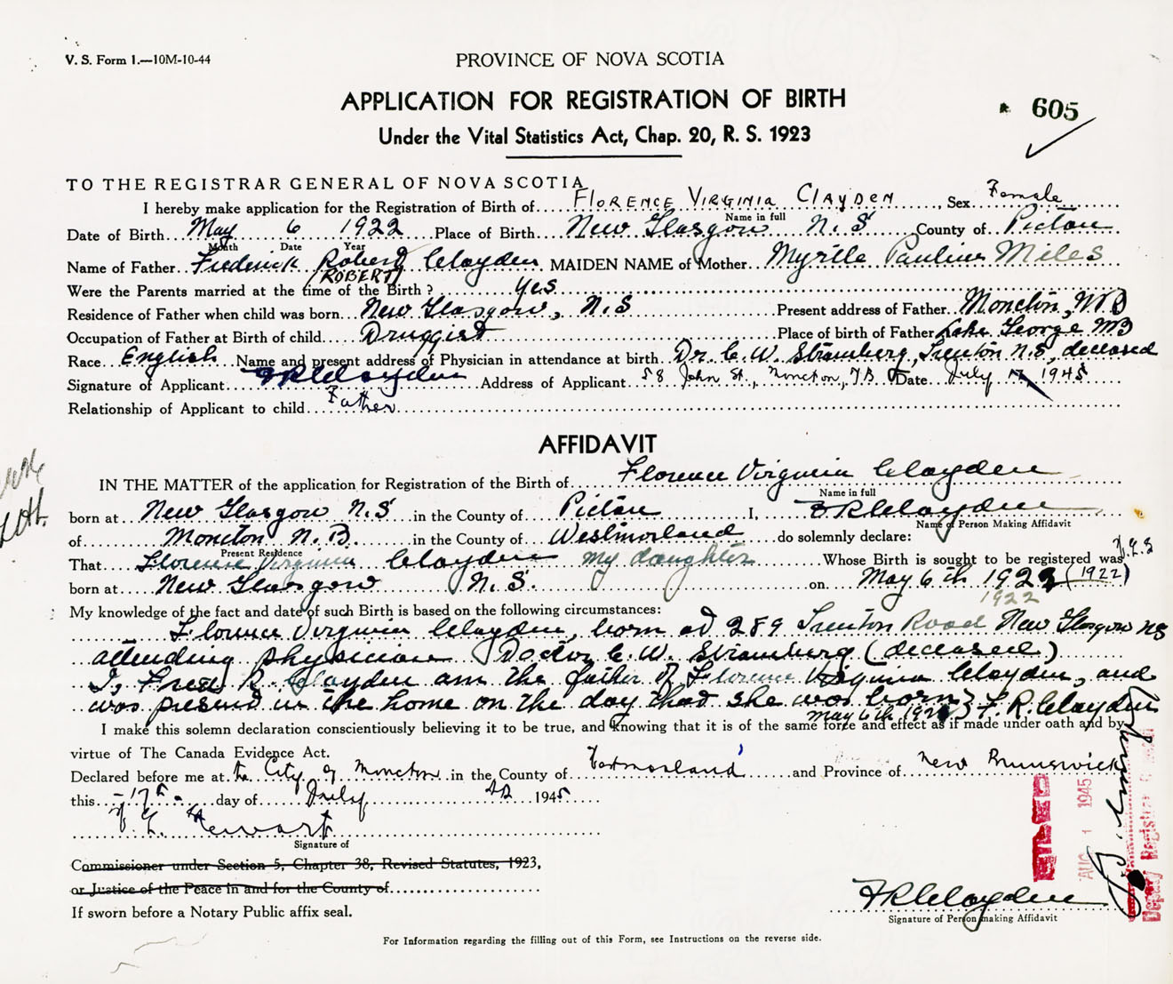 Florence Virginia Claydon born at 289 Trenton Road, New Glasgow, NS. Attending Physician Doctor C. W. Stramberg (deceased). I, Fred R. Clayden am the father of Florence Virginia Clayden, and was present in the home on the day that she was born - May 6th, 1922 - F. R. Claydon