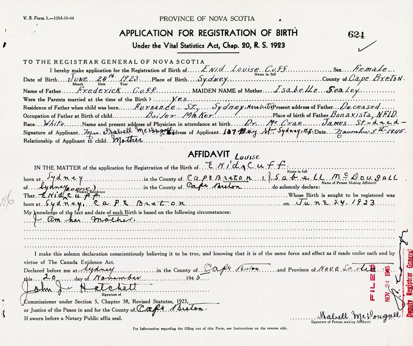 I hereby make application for the Registration of Birth of Enid LouiseCuff Sex Female
