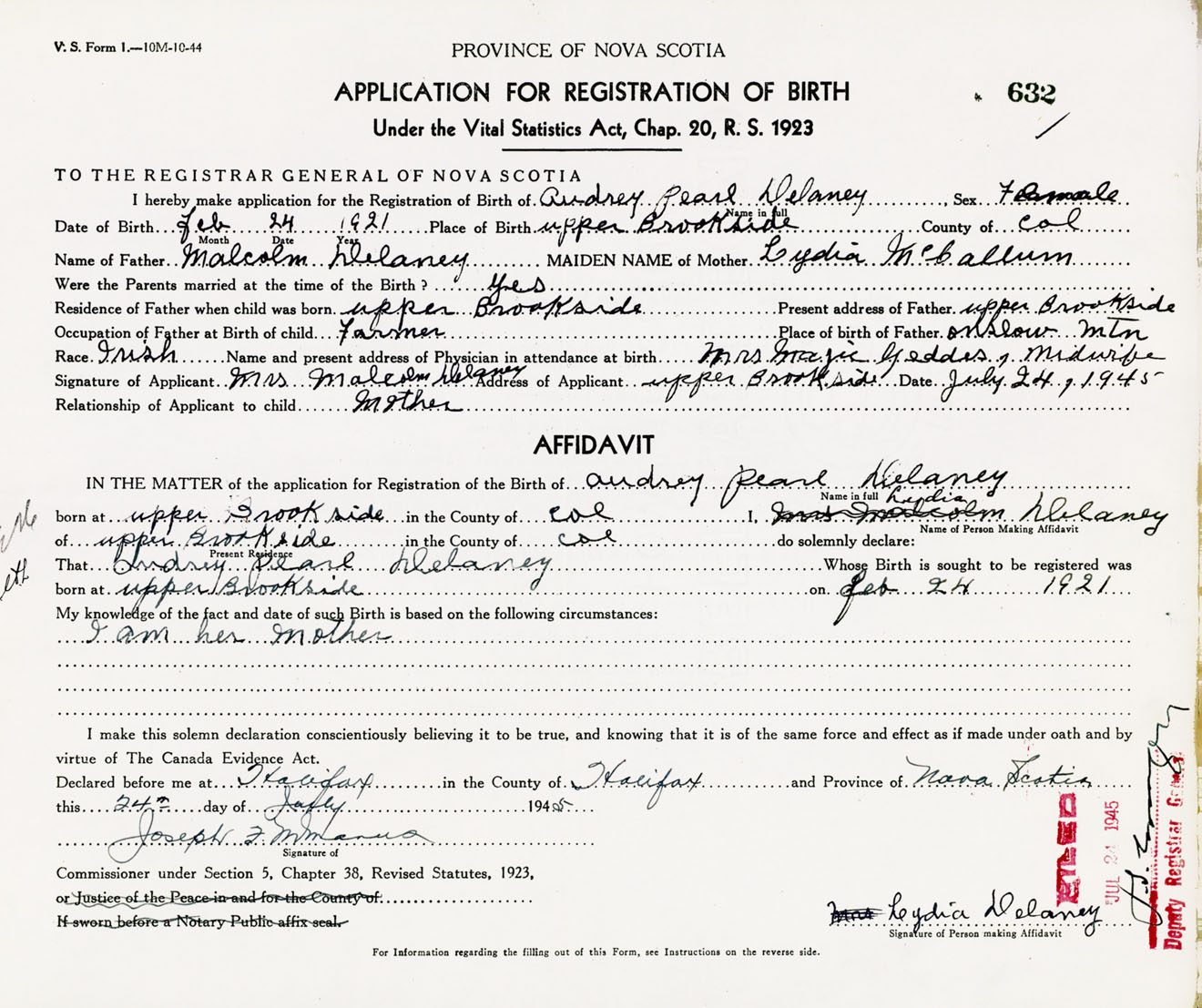 Signature of Applicant Mrs. Malcolm Delaney Address of Applicant Upper Brookside, Colchester Co., NS Date 24 July 1945