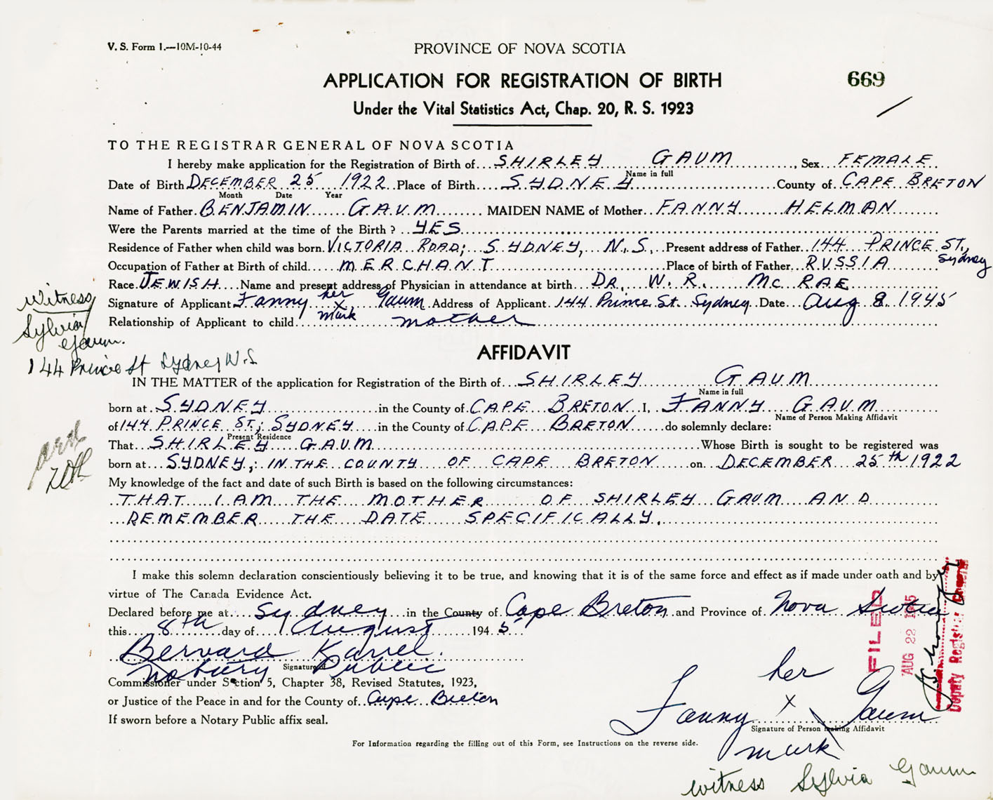 Signature of Applicant Fanny Gaum Address of Applicant 144 Prince Street, Sydney, Cape Breton Co., NS Date 8 August 1945