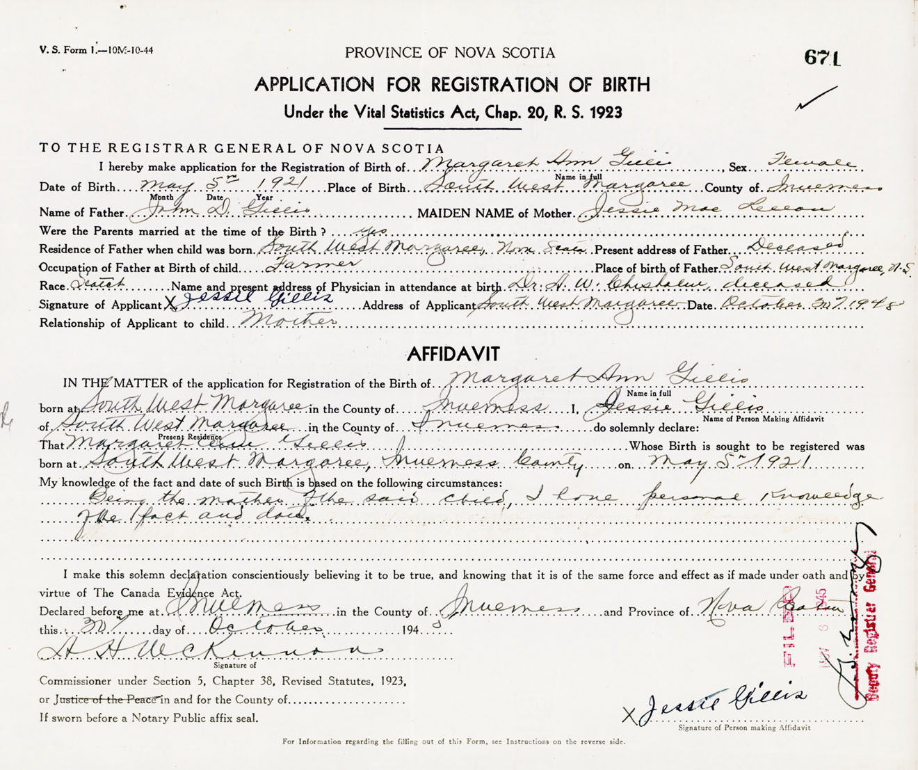 I hereby make application for the Registration of Birth of Margaret AnnGillis Sex Female