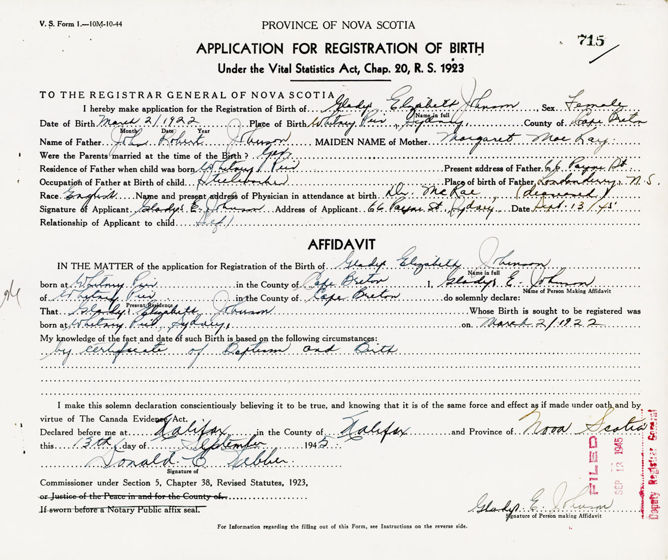 Signature of Applicant Gladys E. Johnson Address of Applicant 66 Payne Street, Sydney, Cape Breton Co. Date 13 September 1945