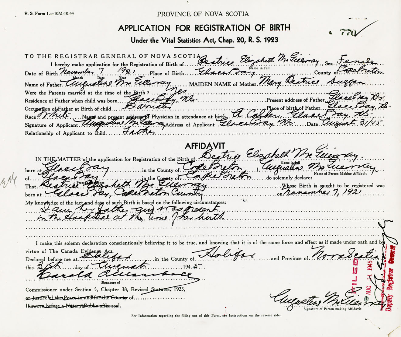 Signature of Applicant Augustine McGillivray Address of Applicant Glace Bay, Cape Breton Co., NS Date 31 August 1945