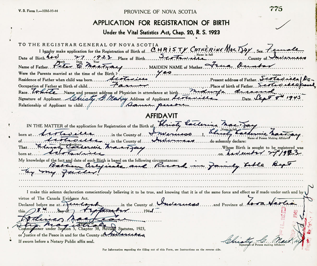 Signature of Applicant Christy C. MacKay Address of Applicant Scotsville, Inverness Co., NS Date 8 September 1945