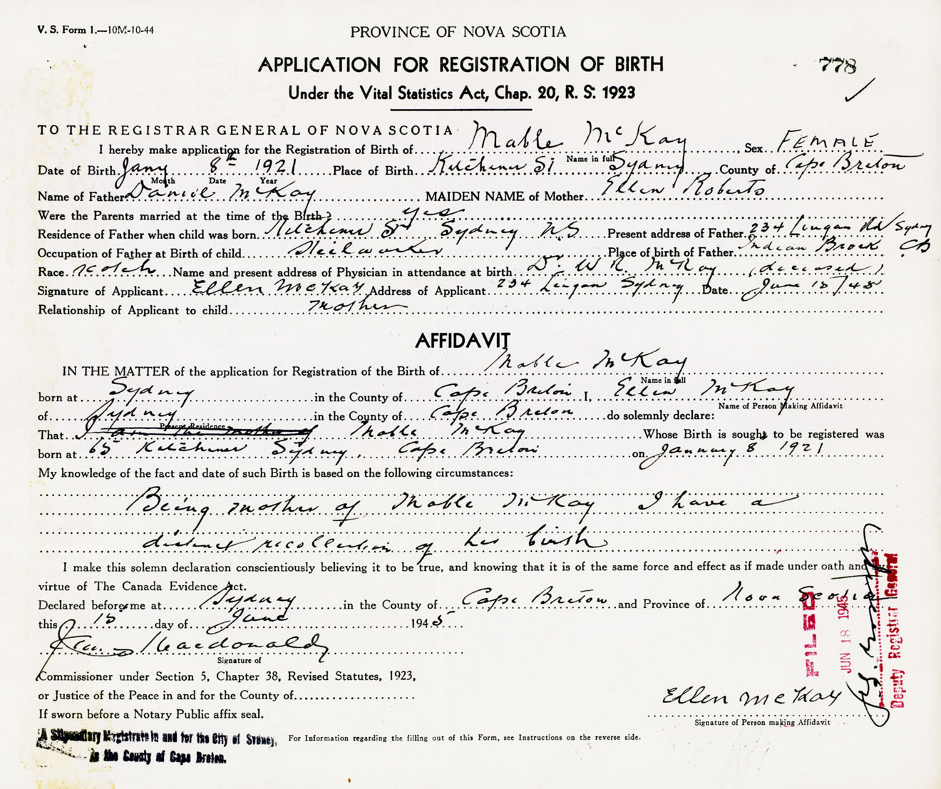Signature of Applicant Ellen McKay Address of Applicant 234 Lingan Road, Sydney, Cape Breton Co., NS Date 15 June 1945