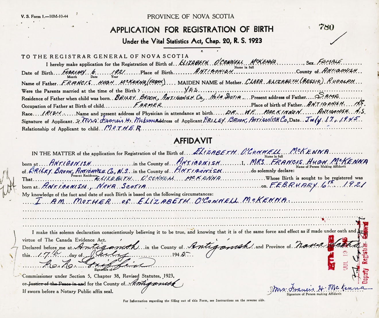 Signature of Applicant Mrs. Francis H. McKenna Address of Applicant Brierly Brook, Antigonish Co., NS Date 17 July 1945