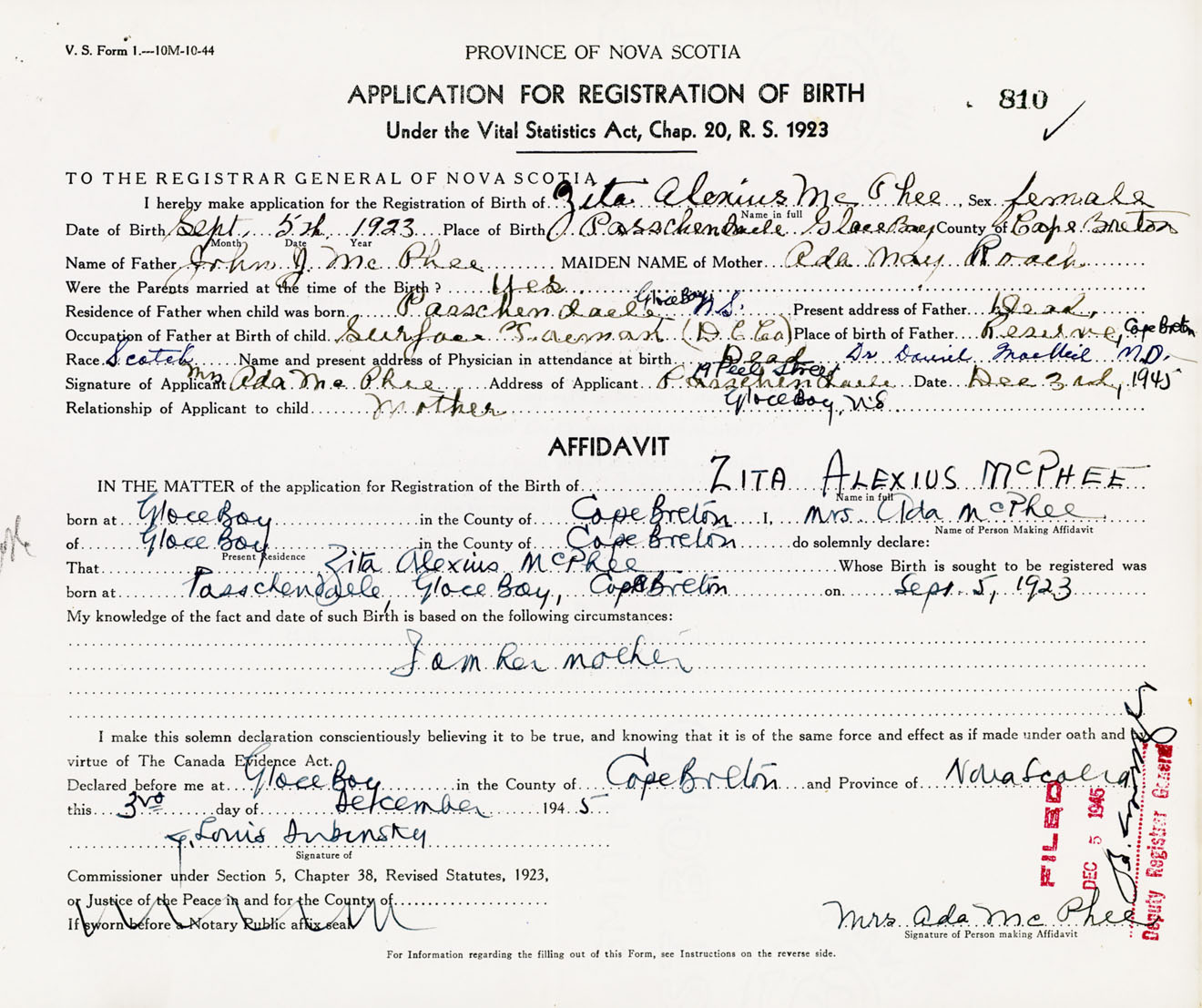 I hereby make application for the Registration of Birth of Zita AlexiusMcPhee Sex Female