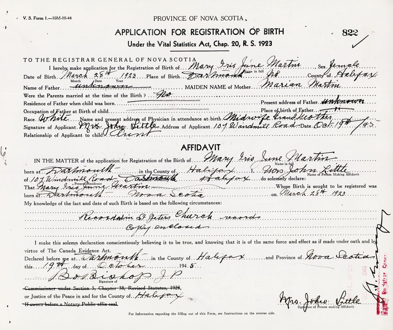 Signature of Applicant Mrs. John Little Address of Applicant 107 Windmill Road, Dartmouth, NS Date 19 October 1945