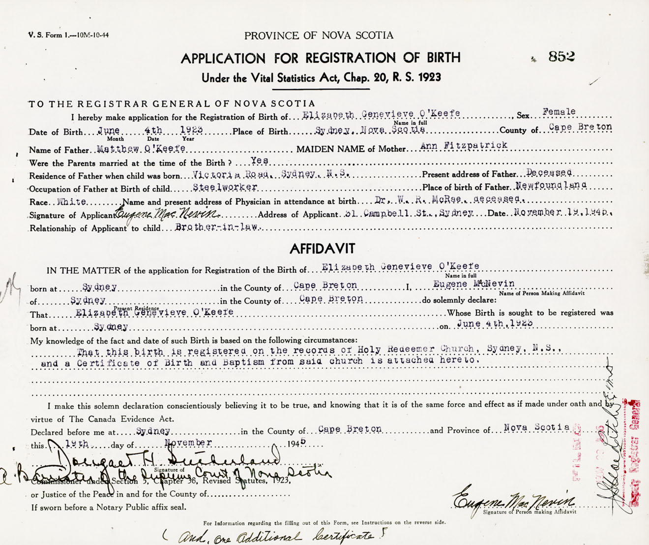 Signature of Applicant Eugene MacNevin Address of Applicant 31 Campbell Street, Sydney, Cape Breton Co., NS Date 19 November 1945