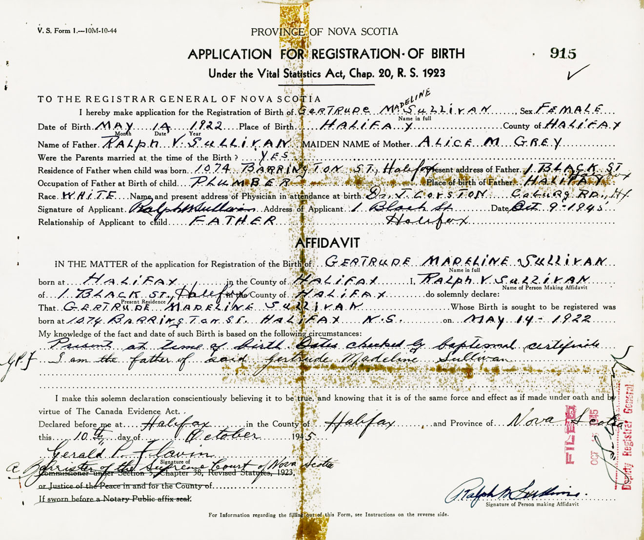 Signature of Applicant Ralph V. Sullivan Address of Applicant 1 Black Street, Halifax, NS Date 9 October 1945
