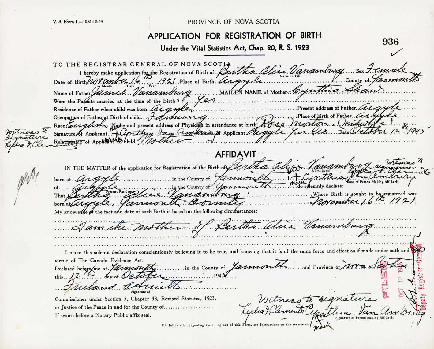 Signature of Applicant Cynthia VanAmburg Address of Applicant Argyle, Yarmouth Co., NS Date 12 October 1945