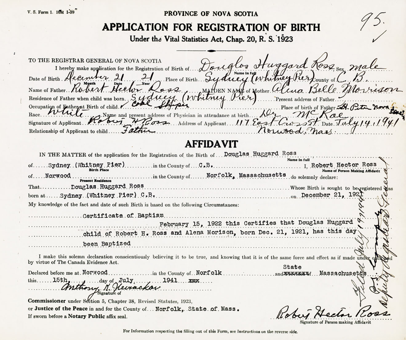 I hereby make application for the Registration of Birth of Douglas HuggardRoss Sex Male