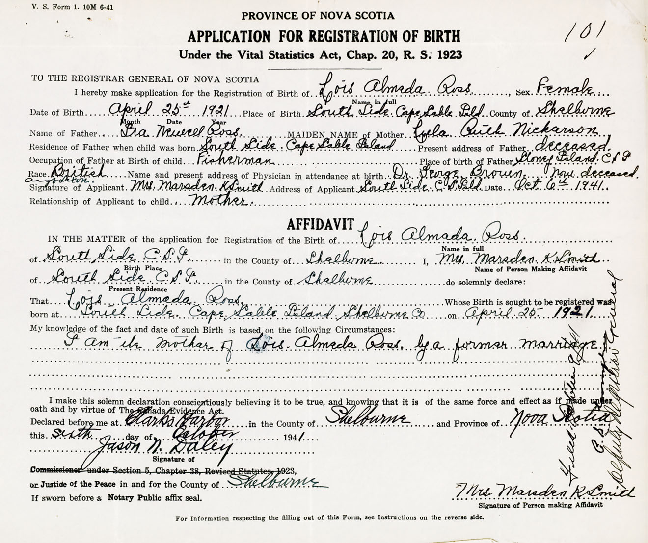 Date of Birth April 25, 1921 Place of Birth South Side Cape Sable IslandCounty of Shelburne