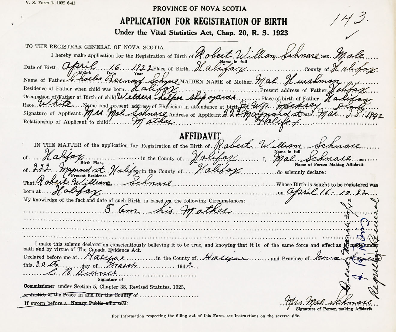 Signature of Applicant Mrs. Mae Schnare Address of Applicant 222 Maynard Street, Halifax, NS Date 28 March 1942