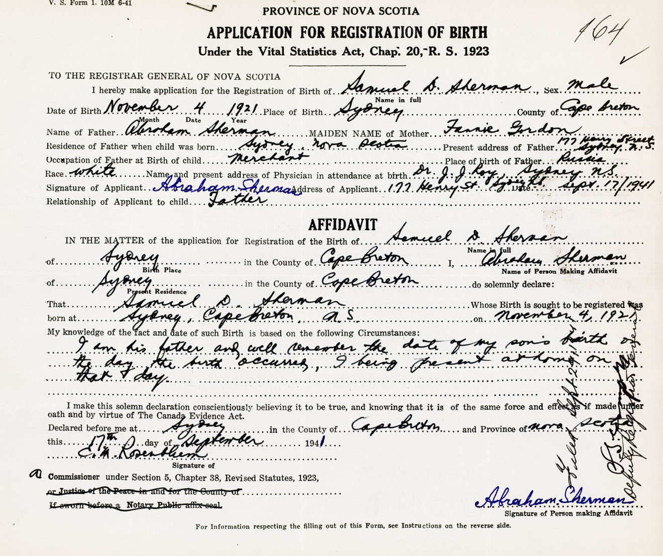 Signature of Applicant Abraham Sherman Address of Applicant 177 Henry Street, Sydney, Cape Breton Co., NS Date 17 September 1941