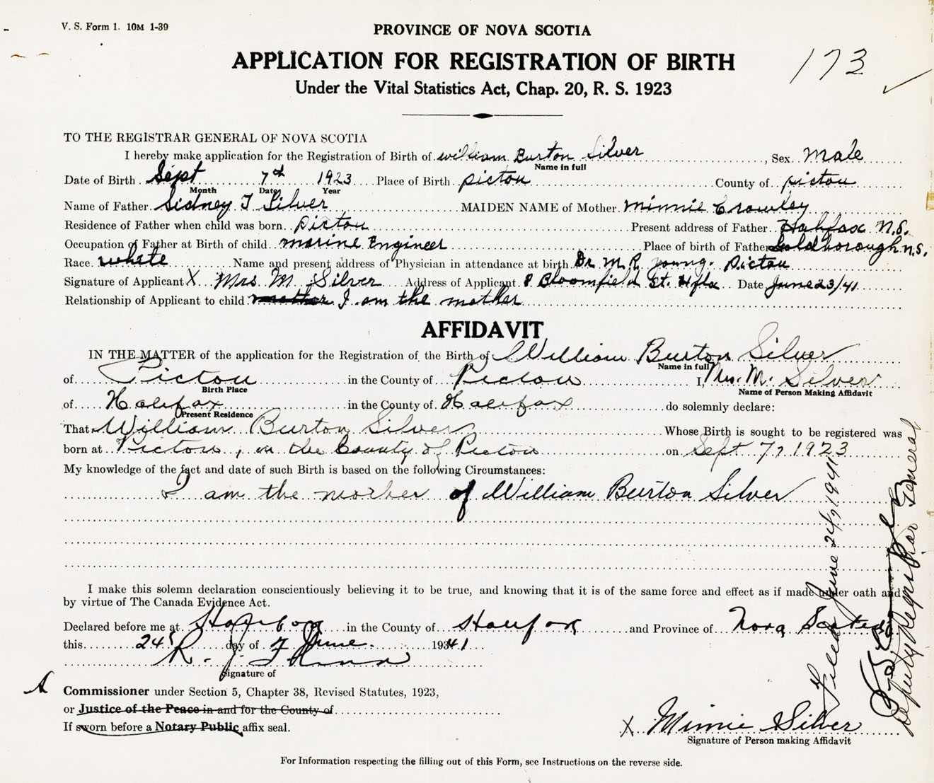 Signature of Applicant Mrs. M. Silver Address of Applicant 8 Bloomfield Street, Halifax, NS Date 23 June 1941