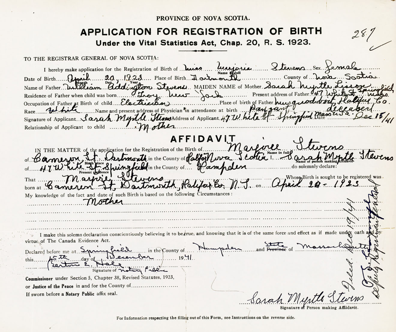 Signature of Applicant Sarah Myrtle Stevens Address of Applicant 47 White Street, Springfield, Massachusetts, USA Date 15 December 1941