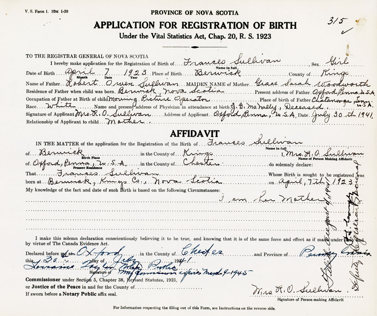 Signature of Applicant Mrs. R. O. Sullivan Address of Applicant Oxford, Pennsylvania, USA Date 30 July 1941