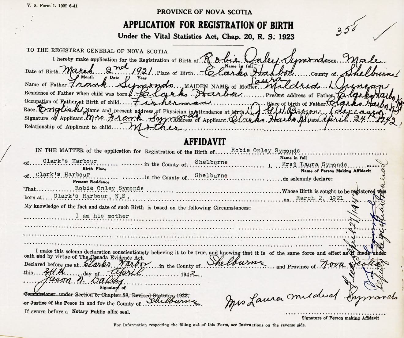 Signature of Applicant Mrs. Frank Symonds Address of Applicant Clarks Harbour, Shelburne Co., NS Date 24 April 1942