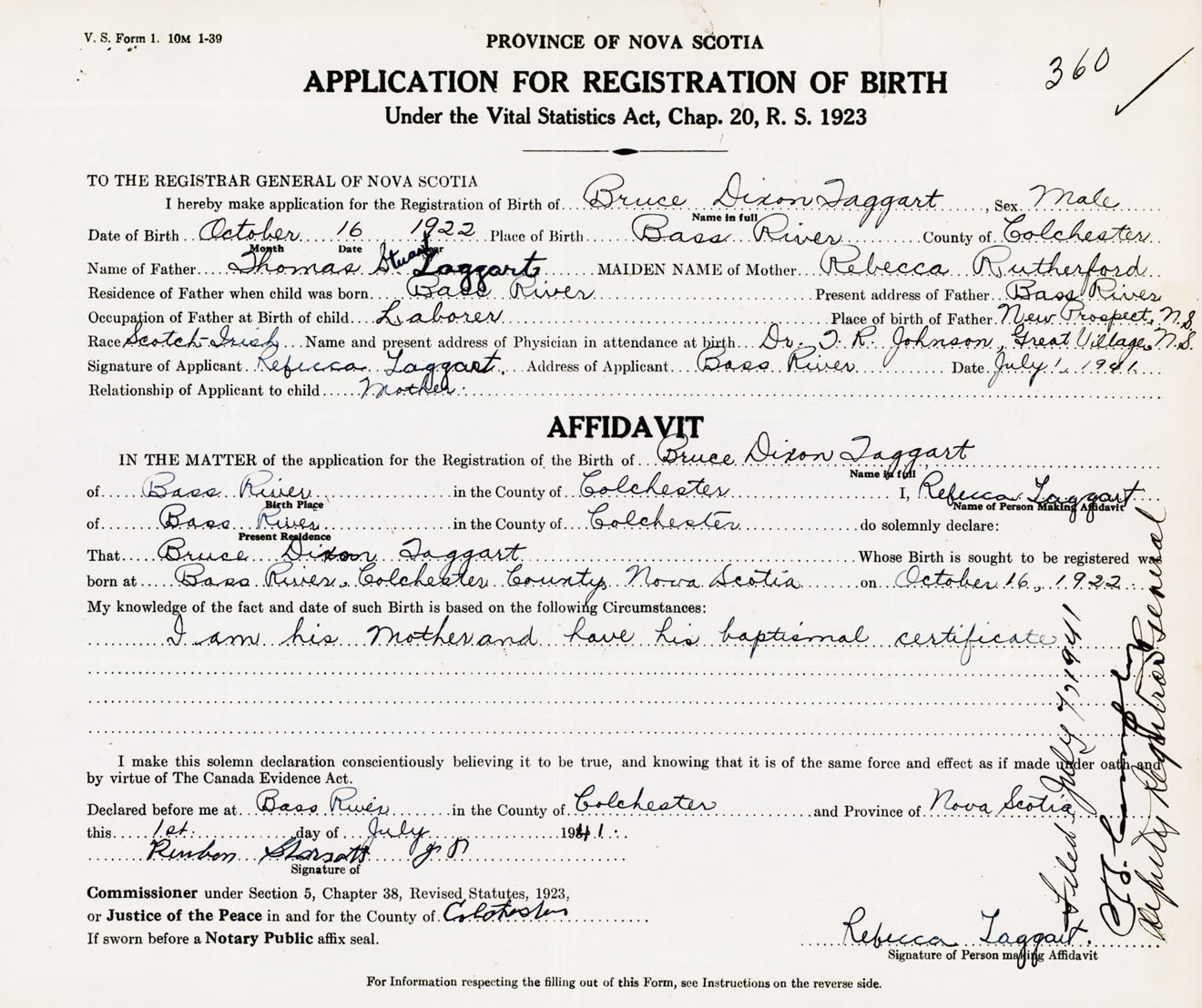 Signature of Applicant Rebecca Taggart Address of Applicant Bass River, Colchester Co., NS Date 1 July 1941