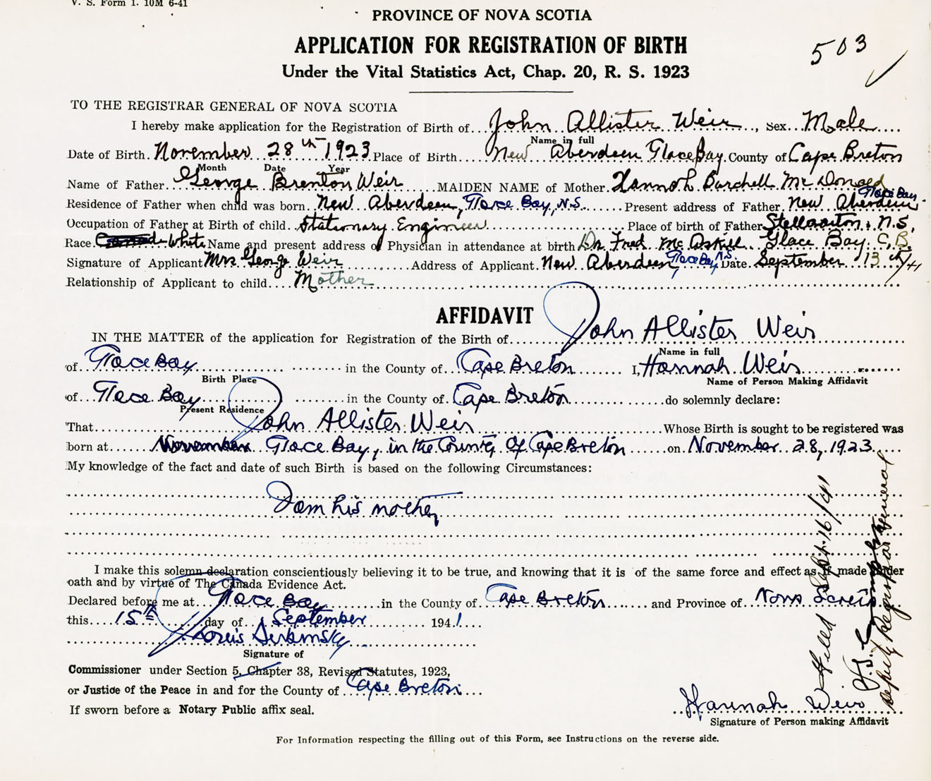 Signature of Applicant Mrs. George Weir Address of Applicant New Aberdeen, Glace Bay, Cape Breton Co., NS Date 13 September 1941