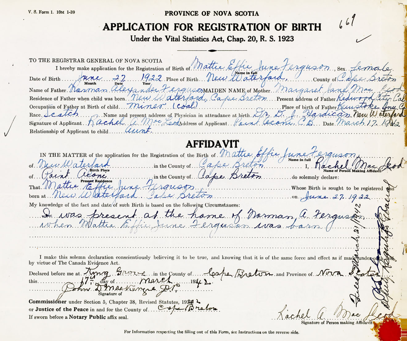 Signature of Applicant Rachel A. MacLeod Address of Applicant Point Aconi, Cape Breton Co., NS Date 17 March 1942