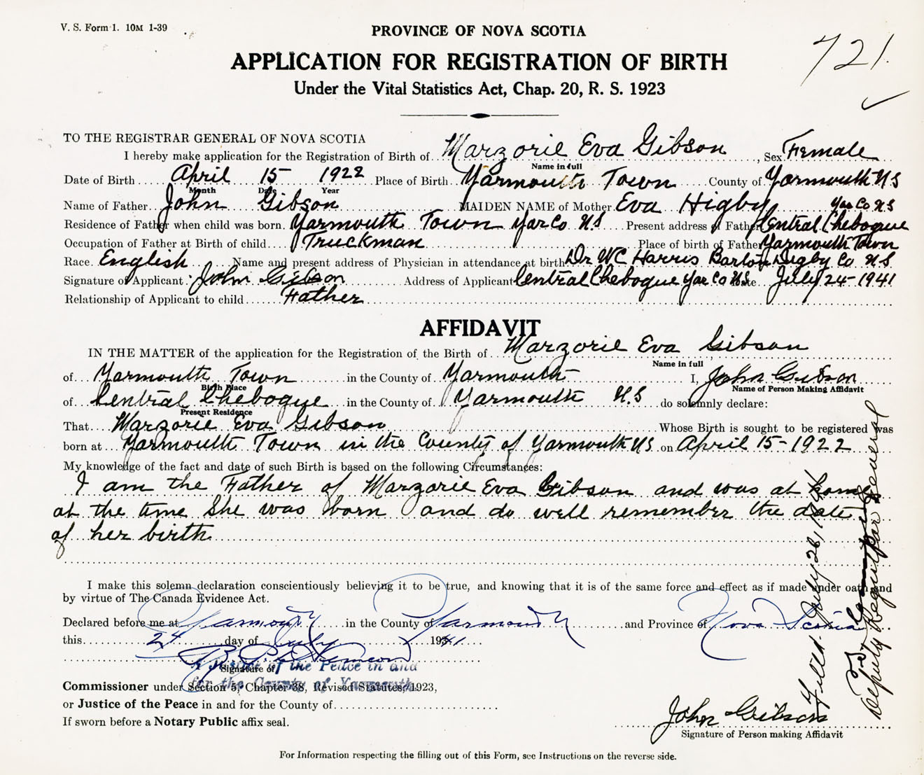 Signature of Applicant John Gibson Address of Applicant Central Chebogue, Yarmouth Co., NS Date 24 July 1941