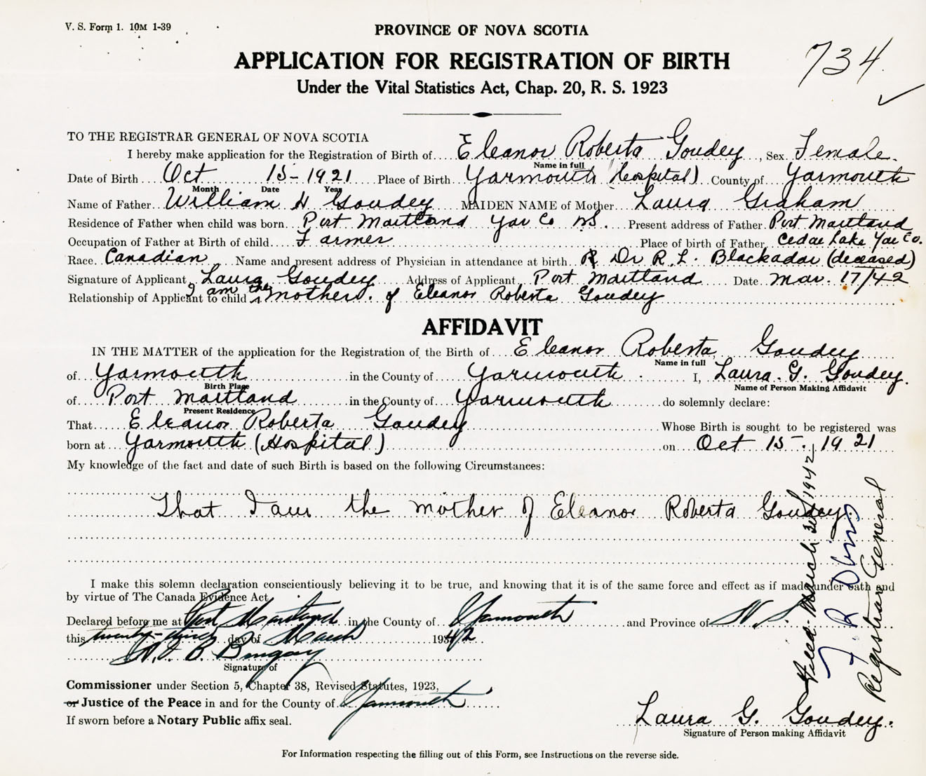 Signature of Applicant Laura Goudey Address of Applicant Port Maitland, Yarmouth Co., NS Date 17 March 1942