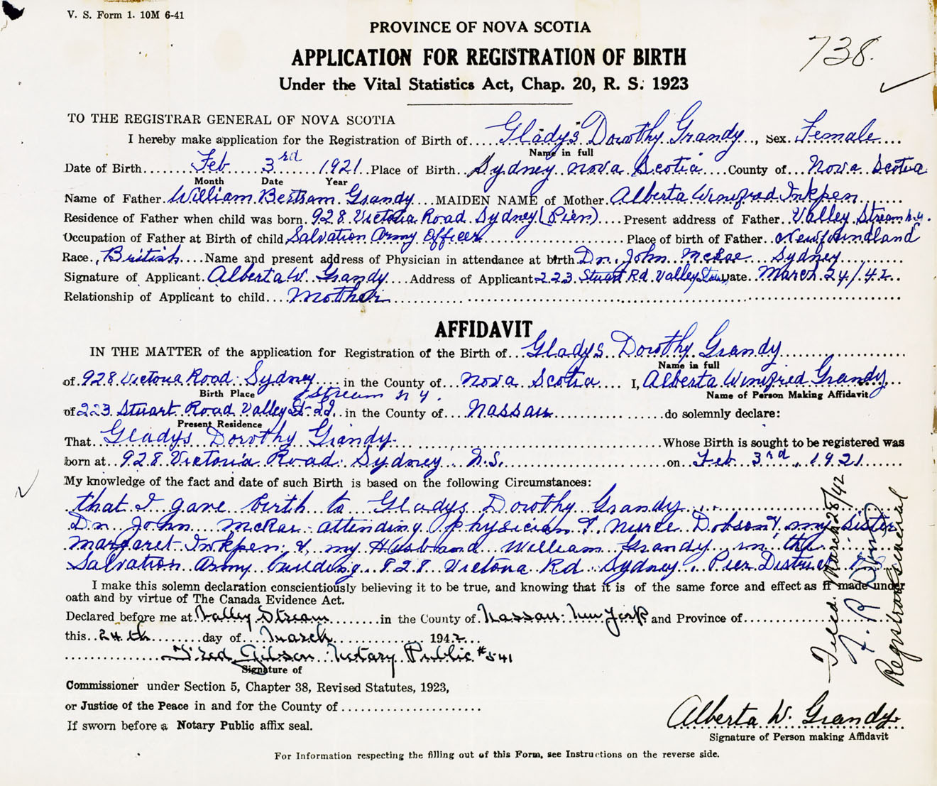 I hereby make application for the Registration of Birth of Gladys DorothyGrandy Sex Female