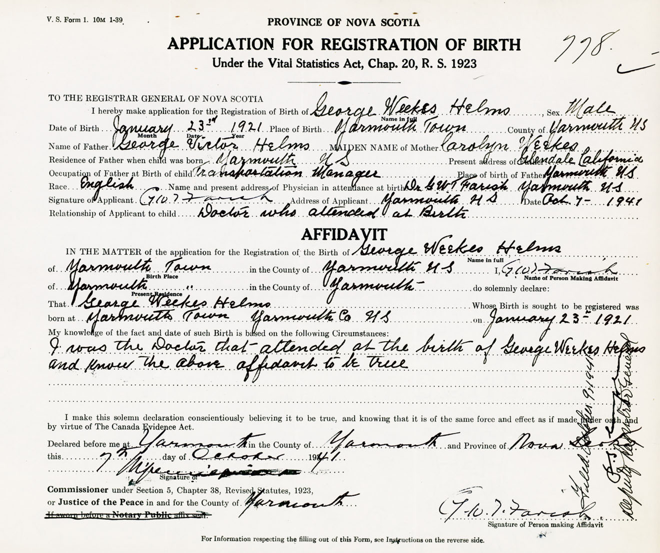 Signature of Applicant G. W. T. Farish Address of Applicant Yarmouth, NS Date 7 October 1941