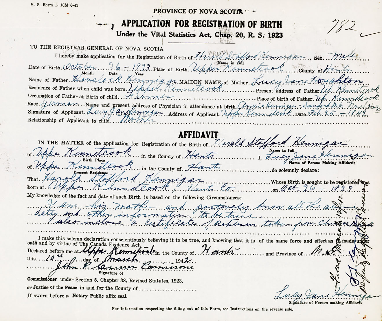 Signature of Applicant Lucy Jane Hennigar Address of Applicant Upper Kennetcook, Hants Co., NS Date 25 February 1942