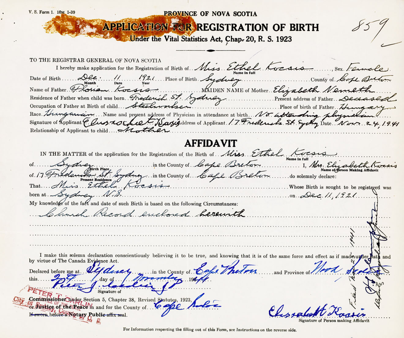 Signature of Applicant Elizabeth Kocsis Address of Applicant 17 Frederick Street, Sydney, Cape Breton Co., NS Date 24 November 1941