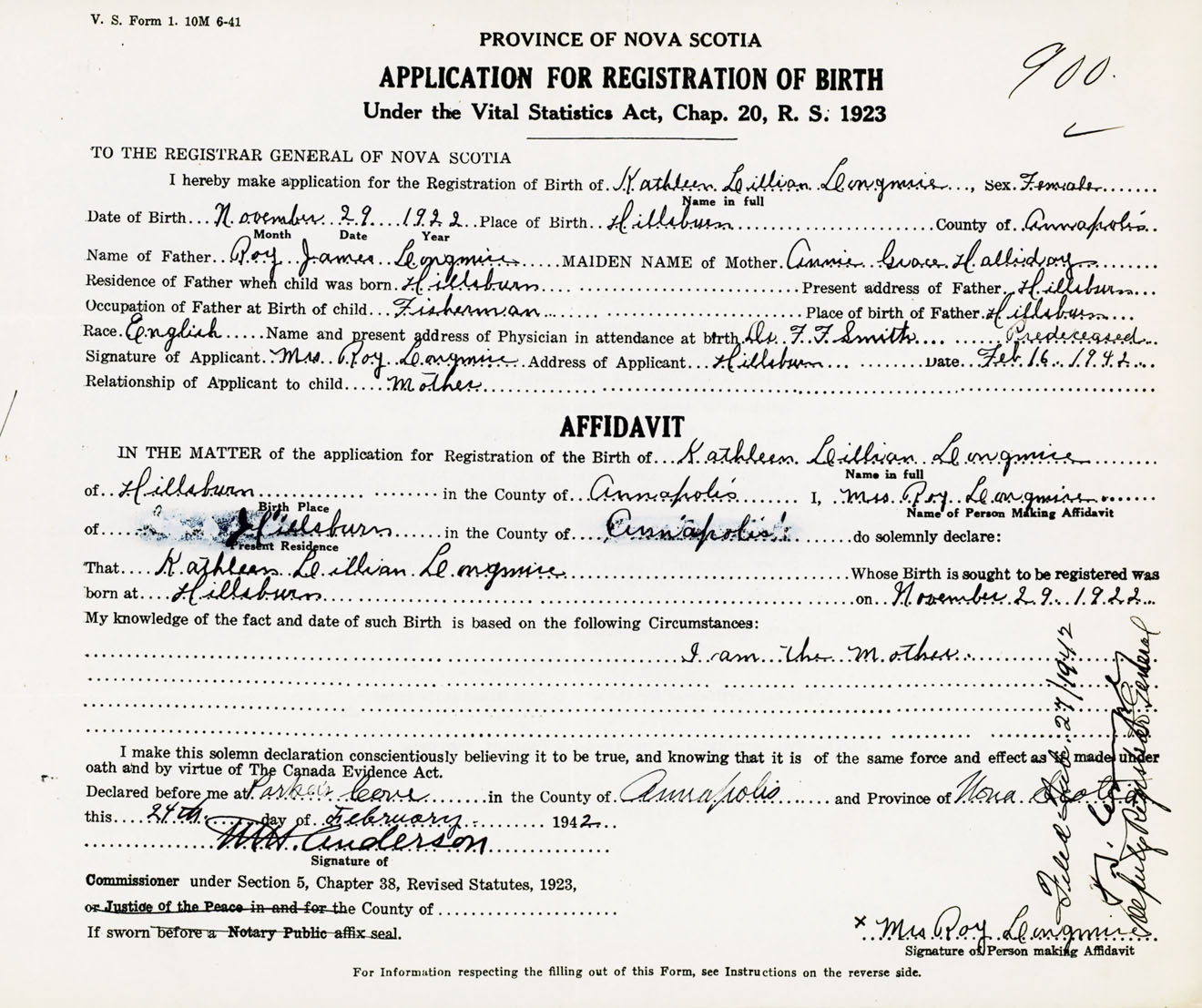 Signature of Applicant Mrs. Roy Longmire Address of Applicant Hillsburn, Annapolis Co., NS Date 16 February 1942