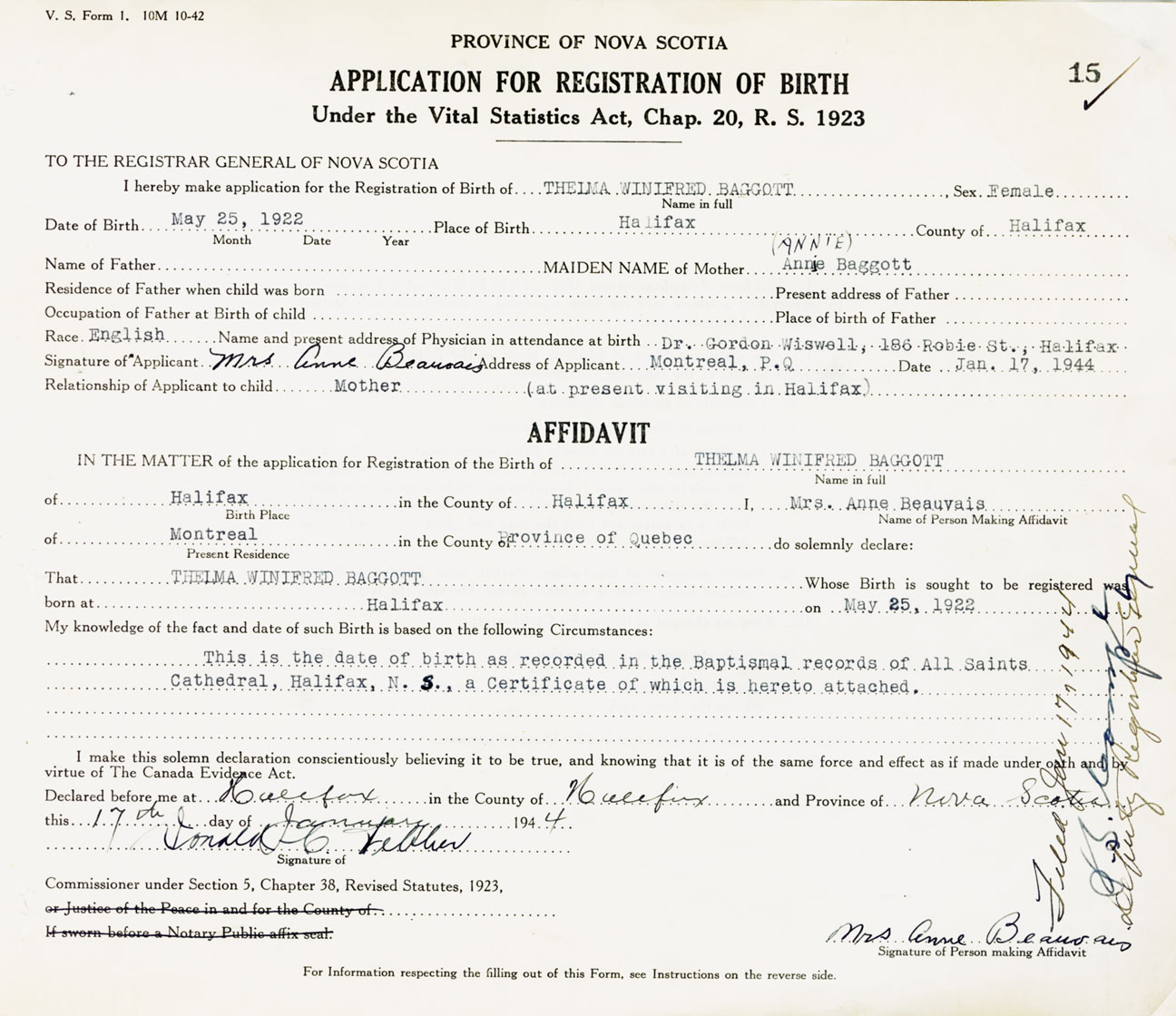 This is the date of birth as recorded in the baptismal records of All Saints Cathedral, Halifax, NS, a certificate of which is hereto attached.