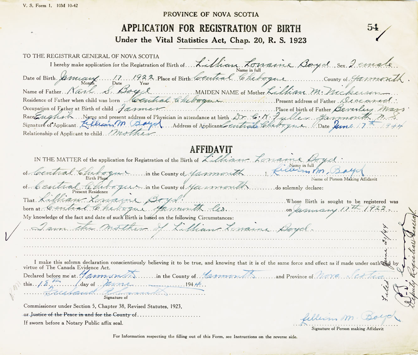 Signature of Applicant Lillian M. Boyd Address of Applicant Central Chebogue Date June 17, 1944