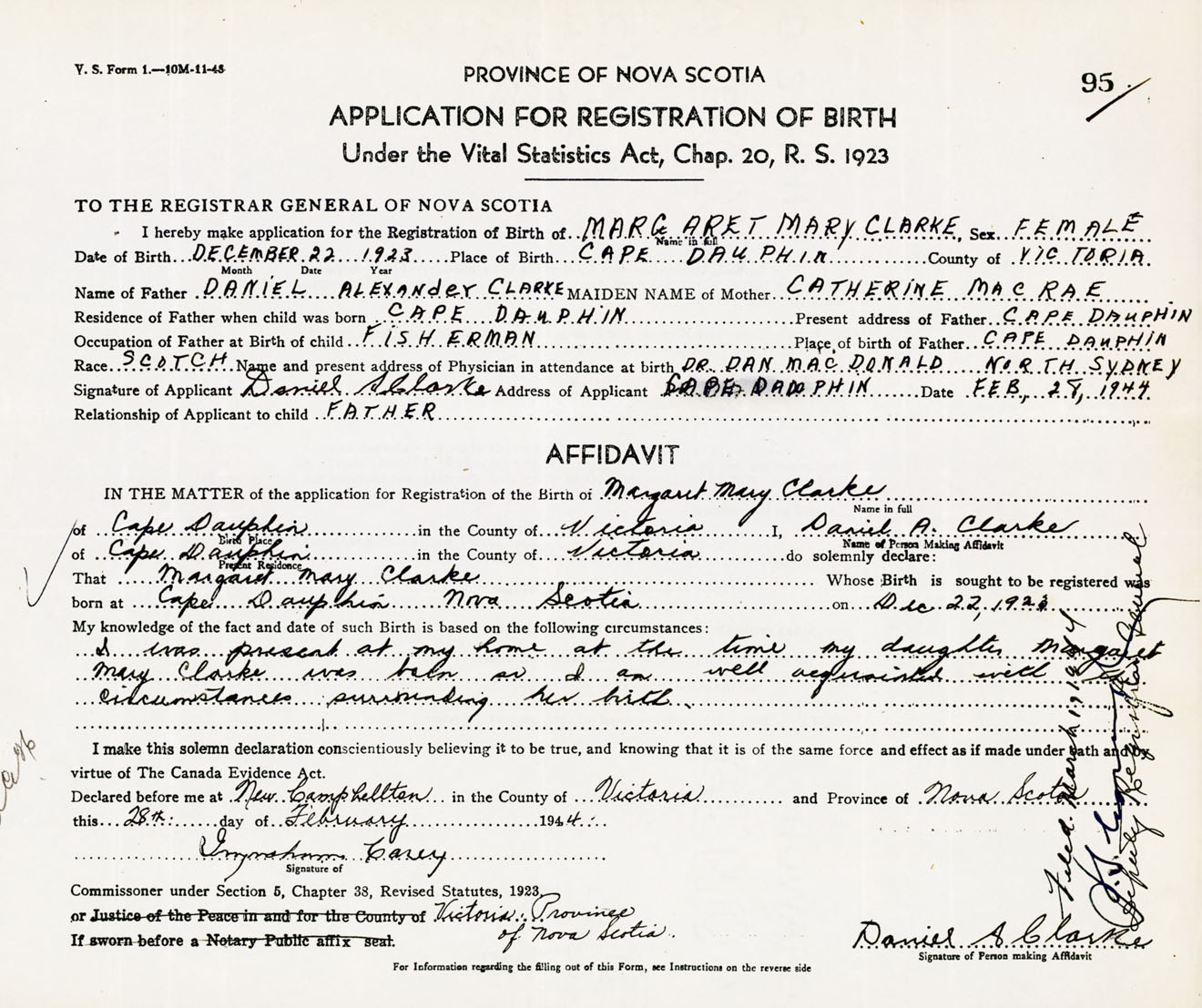 Signature of Applicant Daniel A. Clarke Address of Applicant Cape Dauphin, Victoria Co., NS Date 28 February 1944