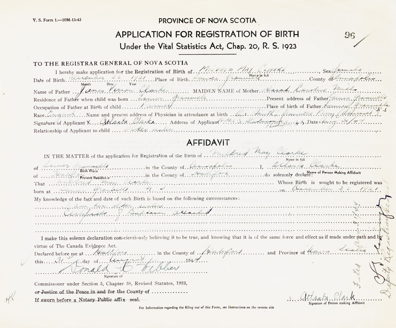 I hereby make application for the Registration of Birth of Mildred MayClarke Sex Female