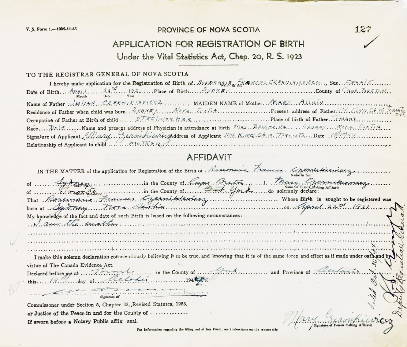 Signature of Applicant Mary Czernikieviecz Address of Applicant 1106 King St. W. Toronto Date April 18, 1944