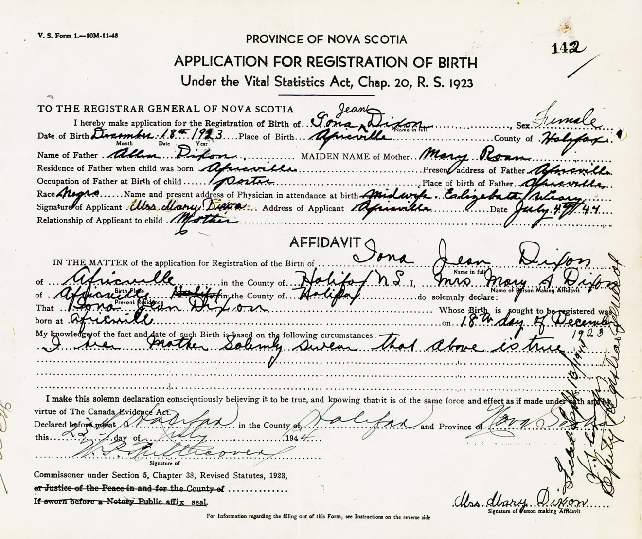 Signature of Applicant Mrs. Mary Dixon Address of Applicant Africville, Halifax Co., NS Date 4 July 1944