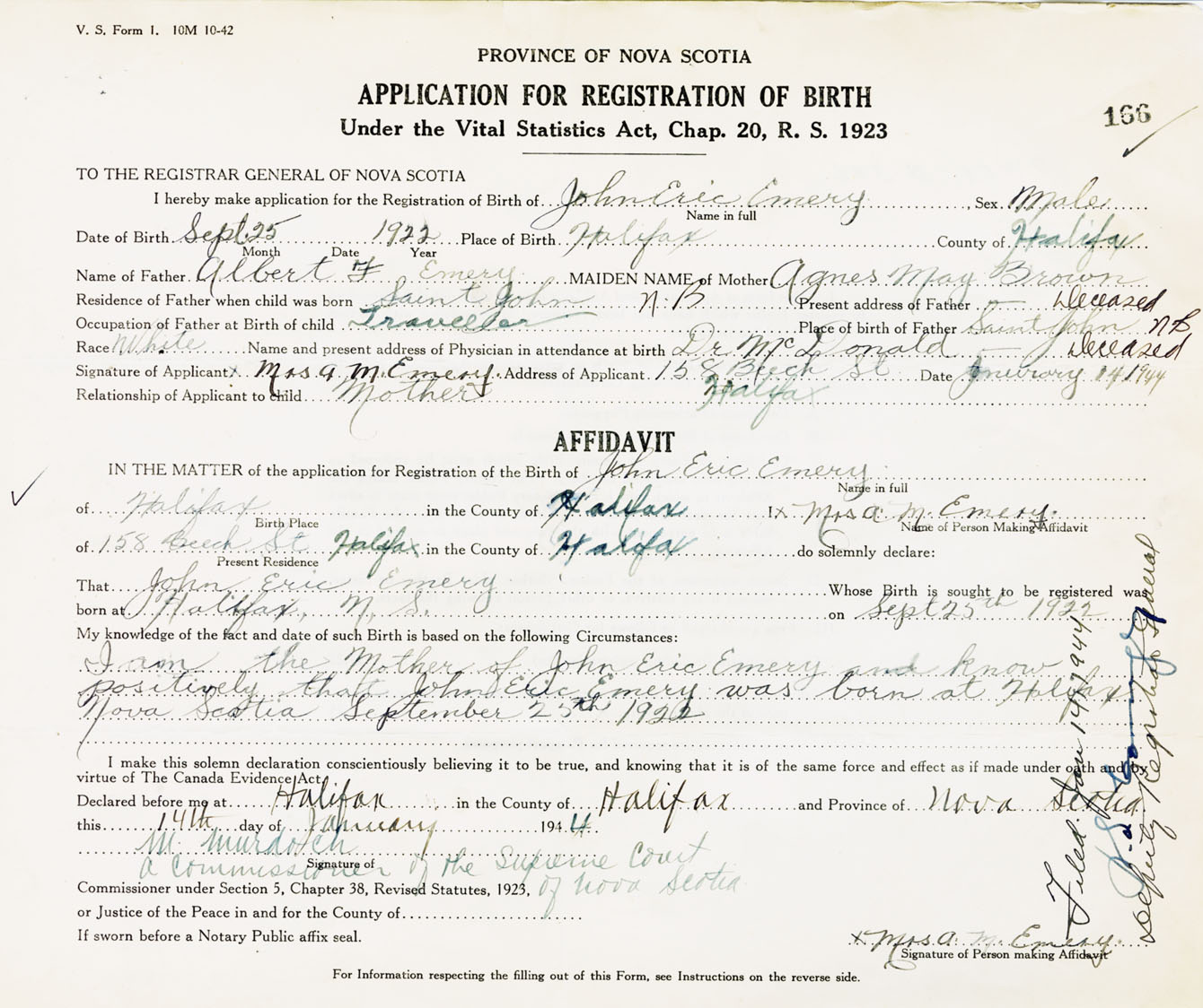 I am the mother of John Eric Emery and know positively that John Eric Emery was born at Halifax, Nova Scotia, September 25th, 1922.