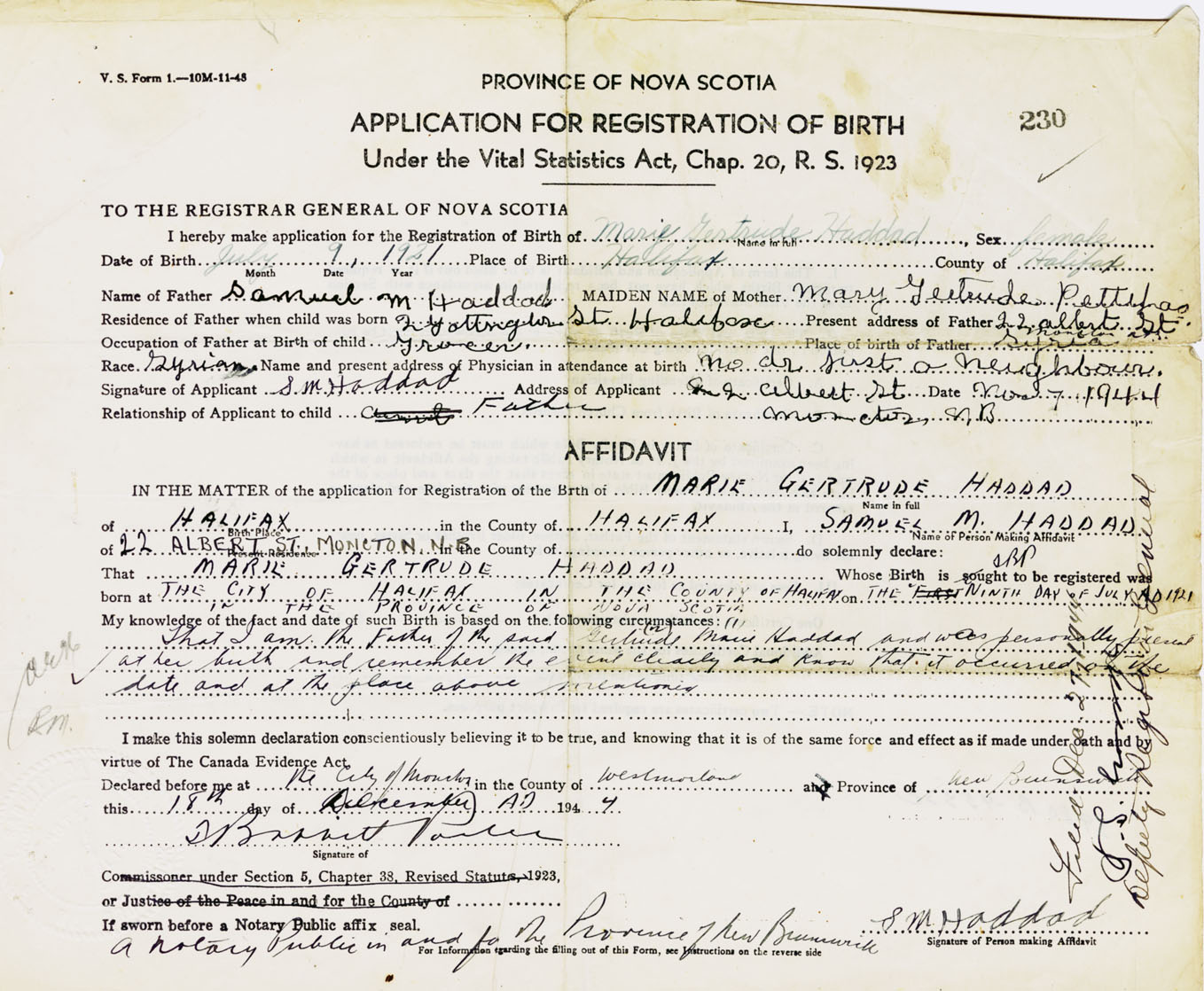 Signature of Applicant S. M. Haddad Address of Applicant 22 Albert Street, Moncton, New Brunswick Date 7 November 1944
