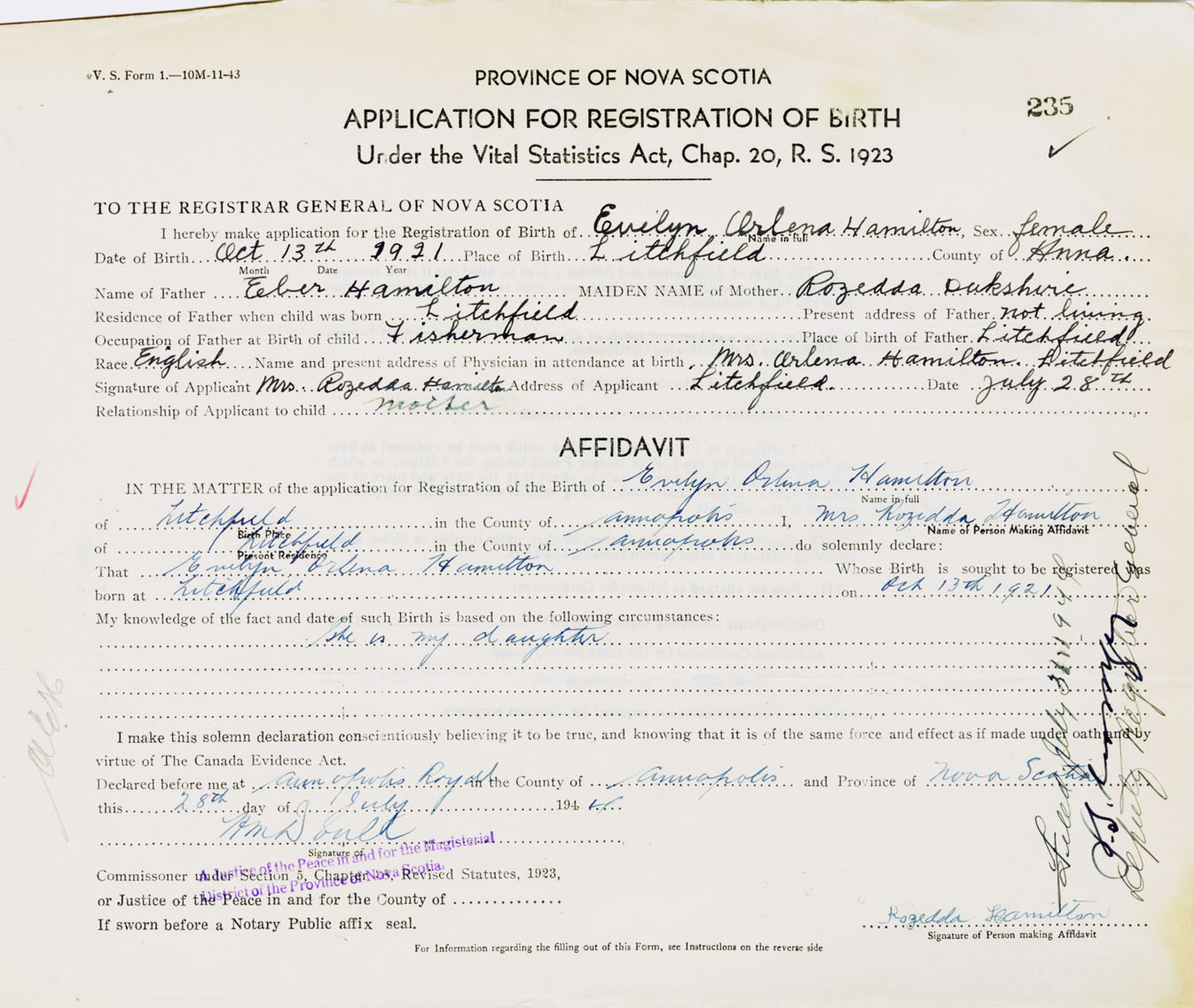 Signature of Applicant Mrs. Rozedda Hamilton Address of Applicant Litchfield, Annapolis Co., NS Date 28 July 1944