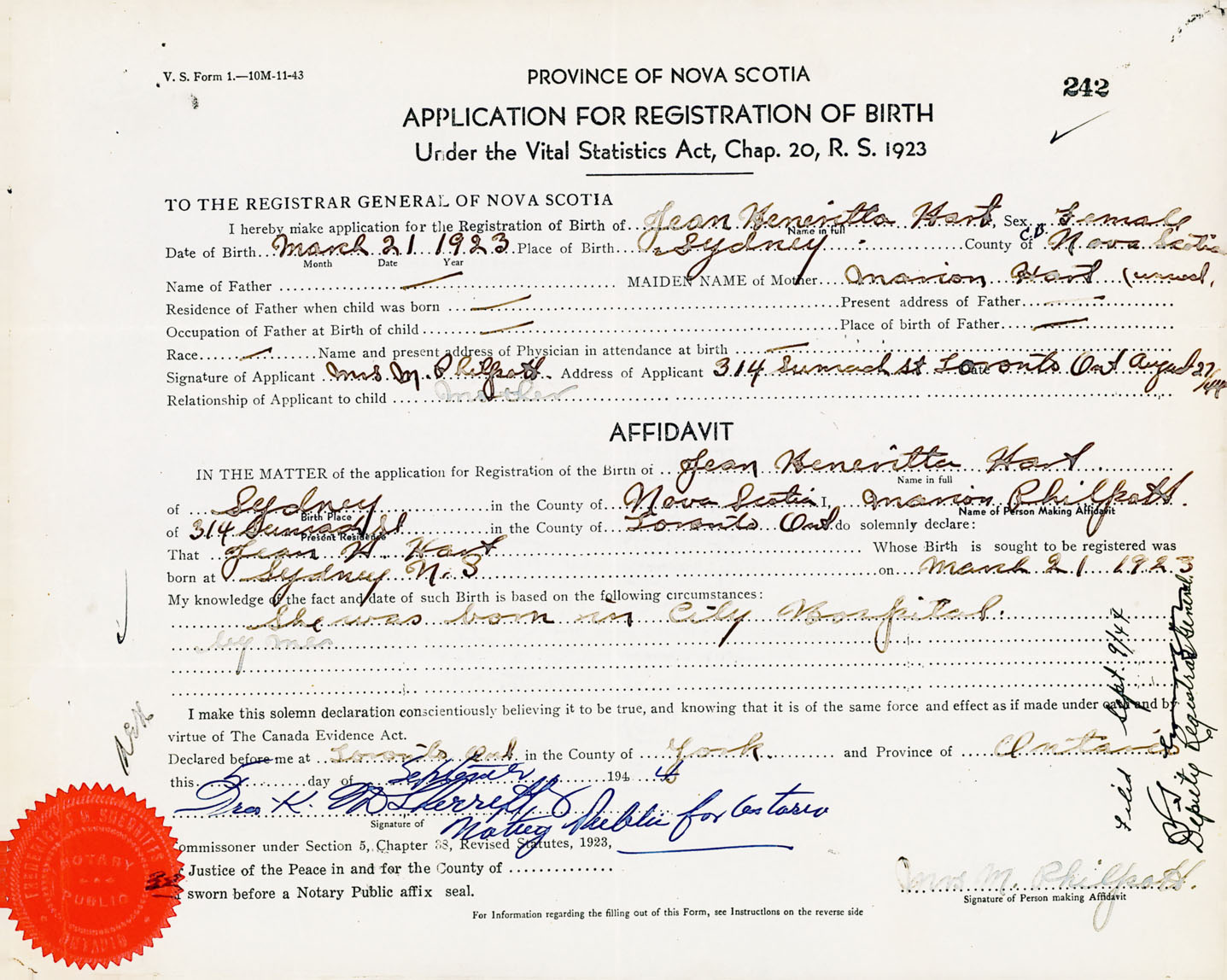 I hereby make application for the Registration of Birth of Jean HenriettaHart Sex Female