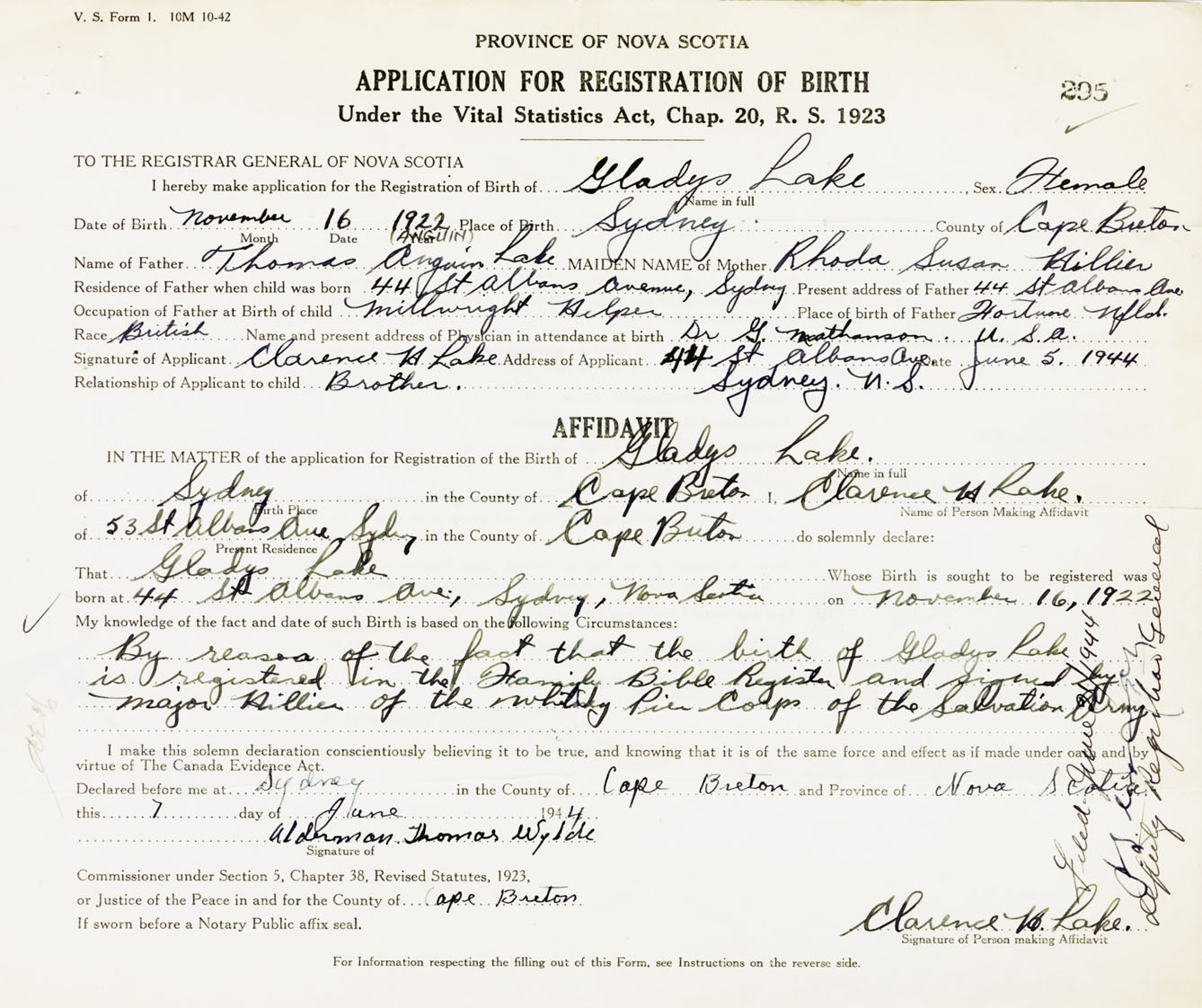 Signature of Applicant Clarence H. Lake Address of Applicant 44 St. Albans Avenue, Sydney, Cape Breton Co., NS Date 5 June 1944